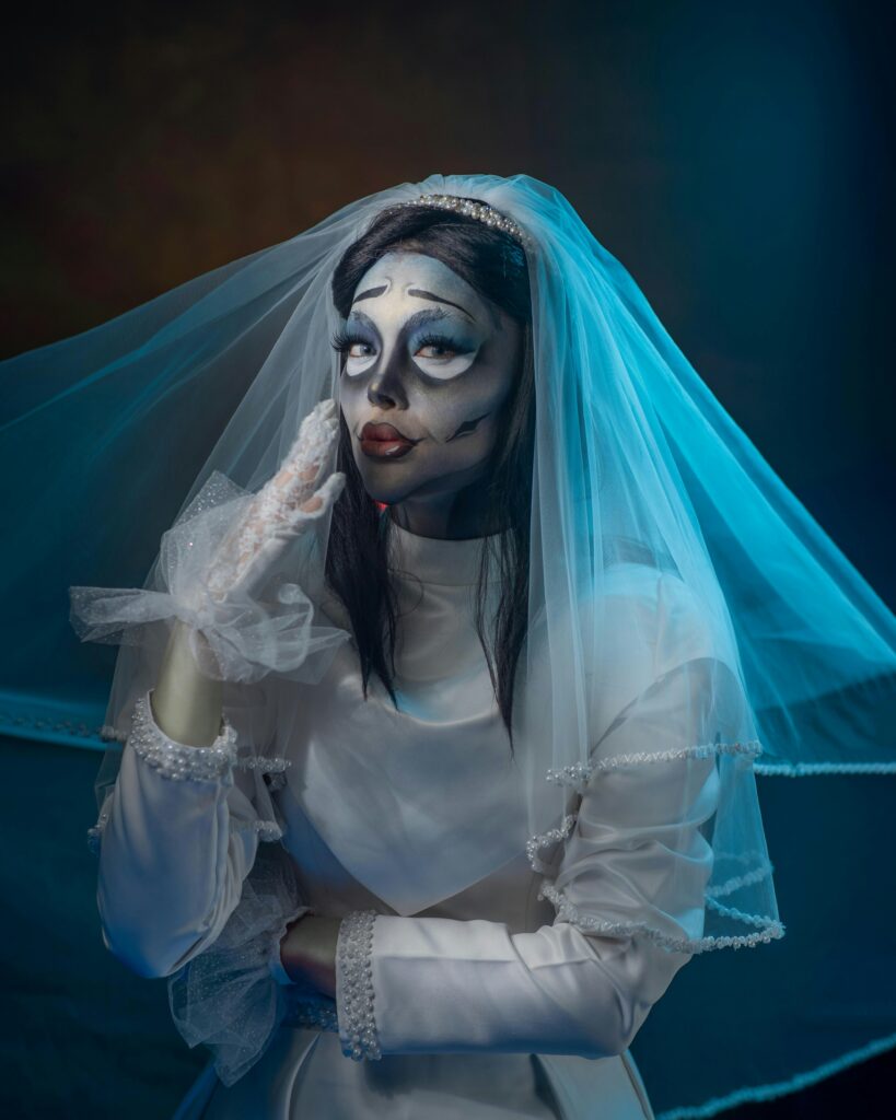 Tim Burton’s undead beauty remains a Halloween classic. Recreate her hauntingly romantic look with a tattered wedding gown, blue body paint, and smoky blue makeup. Add wilted flowers for that tragic, ethereal touch. Shop your costume here.