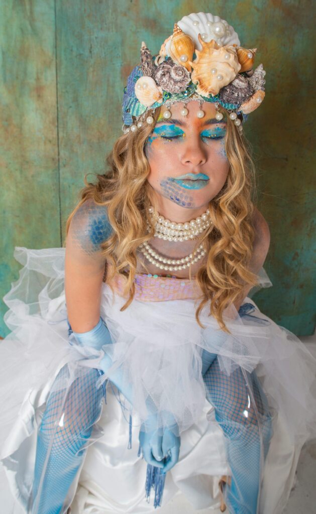 Bring fantasy to life with shimmering sequins, shell jewelry, and holographic makeup. Want a twist? Try a “shipwreck siren” look with torn netting and seaweed details.